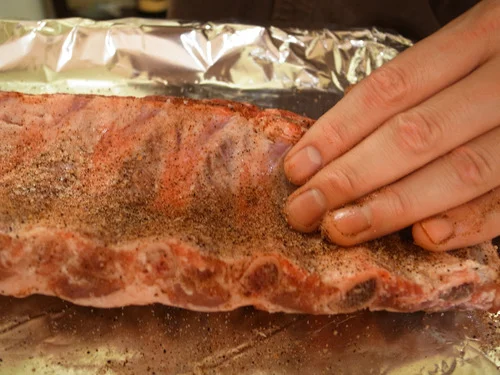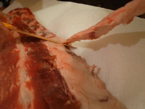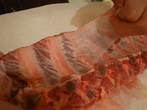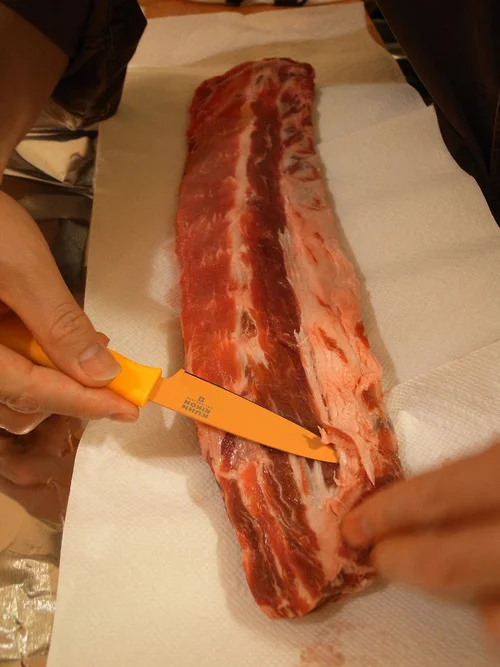 Begin by removing excess fat & silver skin from the rack of ribs.