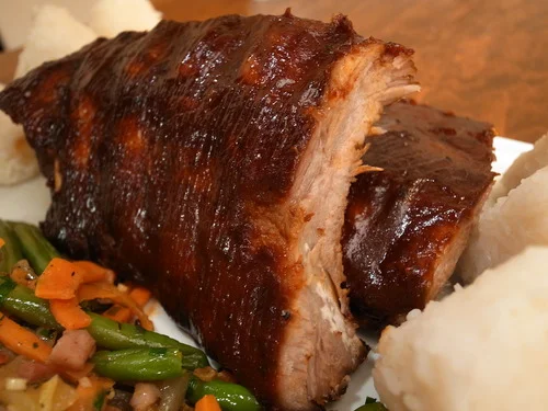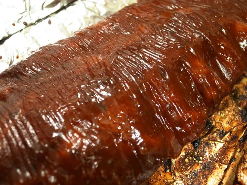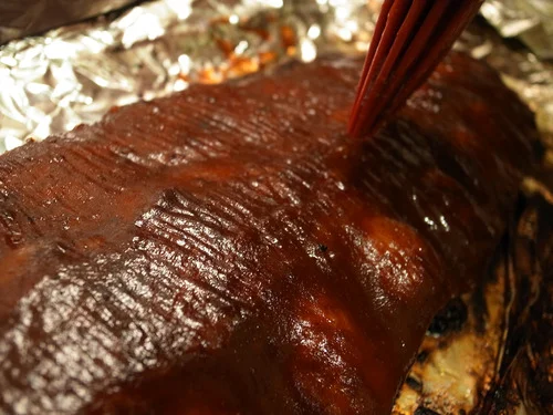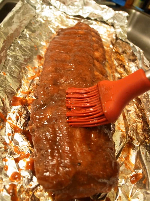 Paint the top side of the ribs and return to the oven. Remove the rack of ribs every 10 minutes to repaint the top surface with fresh sauce until you have a nice sticky coating that has formed. about 4-5 times.