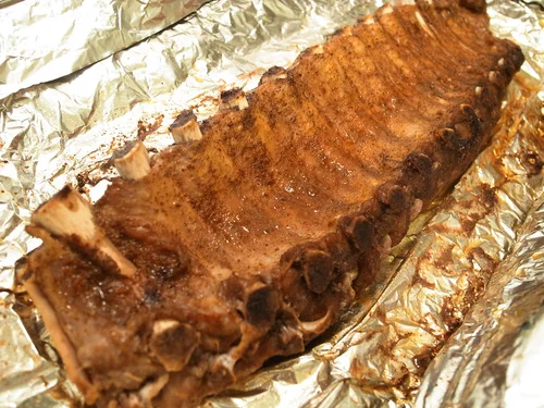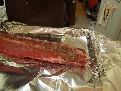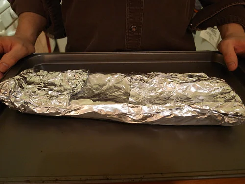 Leave the ribs top side down so it looks like a boat. Wrap the rack in the foil… But not too tight. Then pop it in to a 240 F oven for 2 hours and 15 minutes. No peeking!
