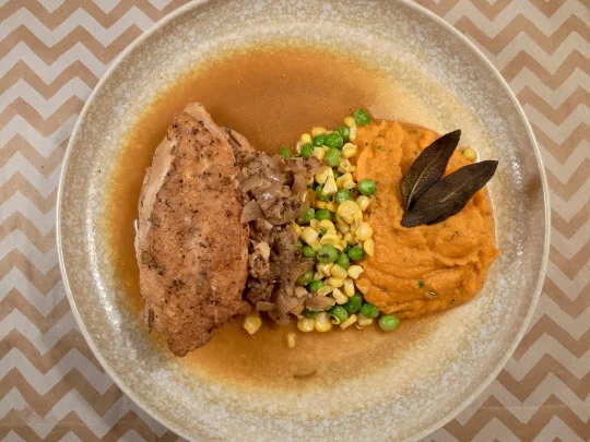 Mustard Braised Chicken, Warm Shallot relish, Local Corn, Fresh Peas, Sweet Potato Horseradish Purée, Fried Sage